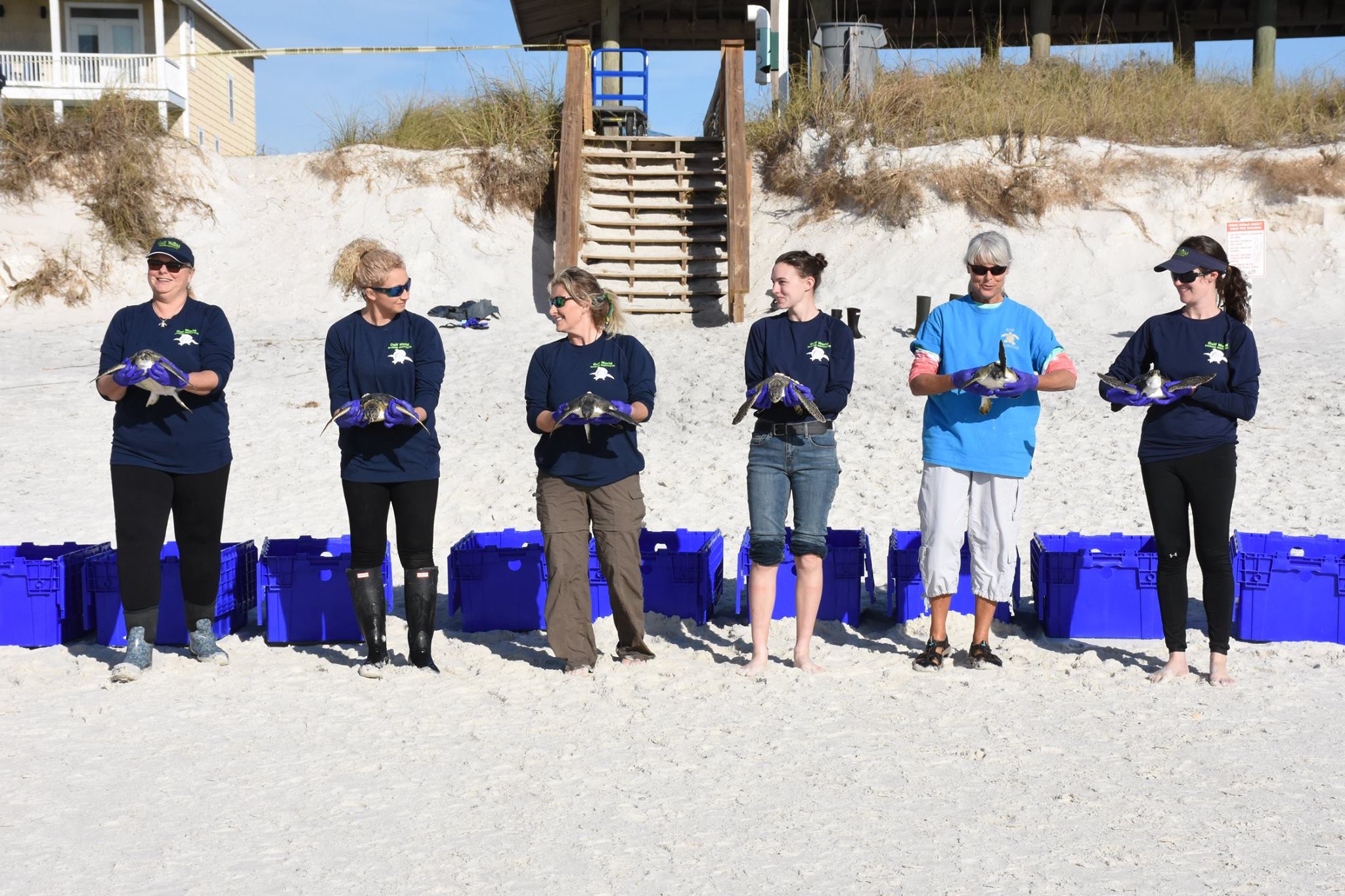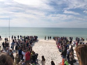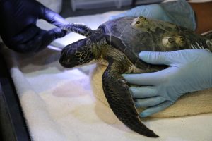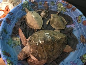 In early January 2018, Gulf World Marine Institute participated in the second-largest sea turtle cold stunning event of the state’s history. Between January 2nd and January 8th, over 800 sea turtles were brought to the facility after having been found “cold-stunned”. After a short gap, another cold front between January 18th through the 19th caused an additional burst of strandings, bringing the total for the event to over 1,220. Sea turtles are marine reptiles, and this means their body temperatures are dependent upon their environment. When the water temperature drops below 50 degrees Fahrenheit, as can happen in bays or estuaries off of the Gulf of Mexico coast, reptilian bodies begin to experience a sensation similar to hypothermia. Blood flow is centralized to their internal organs, and the flippers become immobile, causing the animals to either float or strand alive with dangerously low body temperatures. St. Joseph Bay in the eastern Florida Panhandle is one such location where, when winter temperatures bring the water temperature below 50, the multitude of sea turtles that survive there year round are put at risk. Responses of this magnitude involve the entire conservation community, and members of Florida Fish and Wildlife Conservation Commission, the United States Geological Survey, St. Joseph Bay Buffer Preserve, the Apalachicola National Estuarine Research Reserve (ANERR), and the U.S. Fish and Wildlife Service teamed up with local residents near the Bay to help transport all 1,200 of these animals to Gulf World for assessment. Once the animals arrived, they were given fluids, assessed for additional injuries, and given time to warm before being placed in salt water. Once the body temperatures of the sea turtles had reached the same levels as the Gulf of Mexico, plans were made for release. With the communal efforts of all of the rescuing organizations, the animals were measured, tagged, and transported back to Cape San Blas for a series of releases. The largest release, which featured over 300 sea turtles, was open to the public, and hundreds of people came to watch the turtles be safely returned to the Gulf. Please follow this link to see CBS coverage of the event: https://www.cbsnews.com/news/effort-to-save-cold-stunned-sea-turtles-cold-weather/